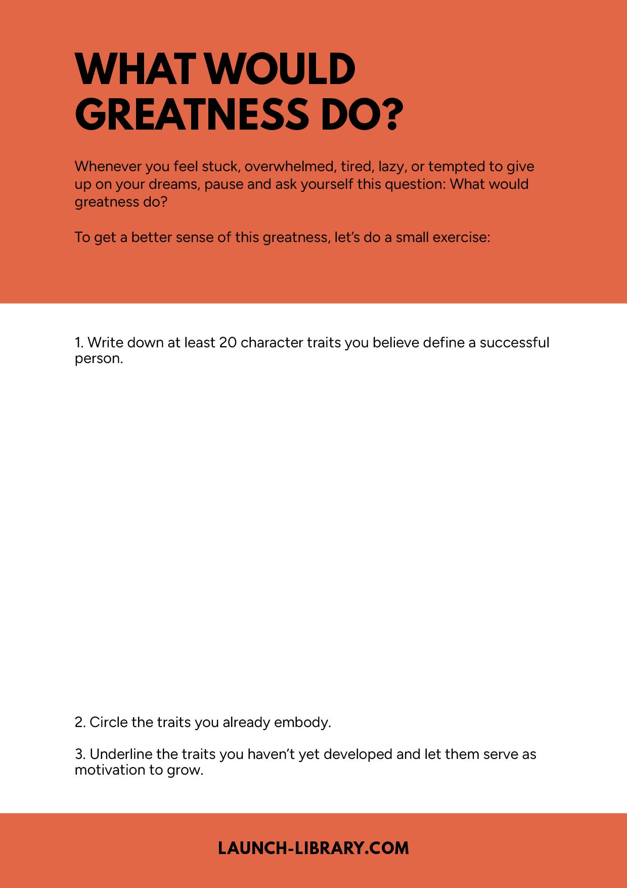 Whenever you feel stuck, overwhelmed, tired, lazy, or tempted to give up on your dreams, pause and ask yourself this question: What would greatness do?